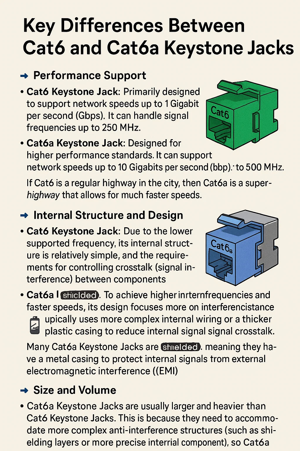 • Cat6a কীস্টোন জ্যাক সাধারণত Cat6 কীস্টোন জ্যাকের চেয়ে **বড় এবং ভারী** হয়।