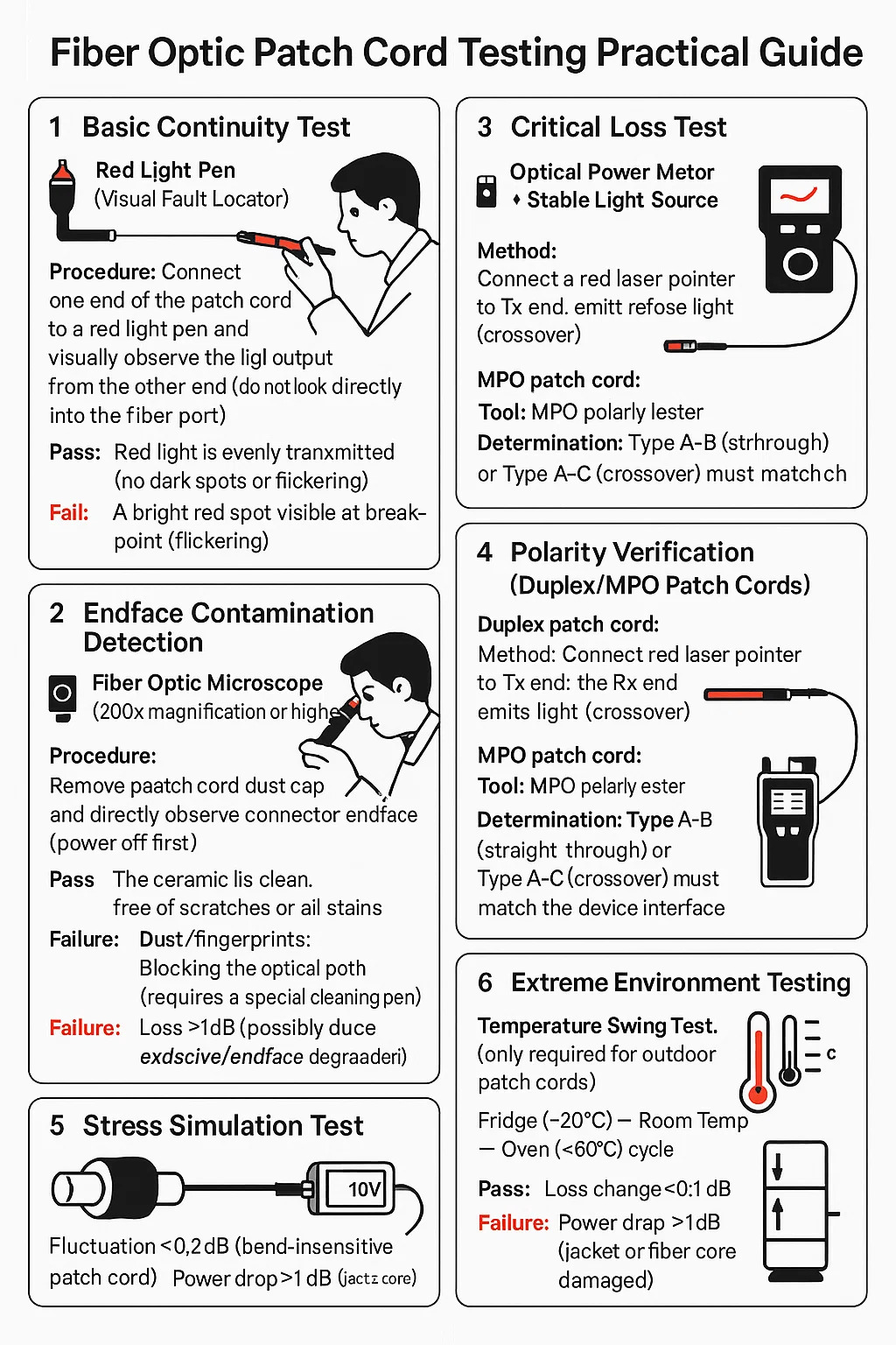 পাস: Fluctuation ≤0.2dB (bend-insensitive patch cord). Failure: Power drop > 1dB (jacket or fiber core damaged).