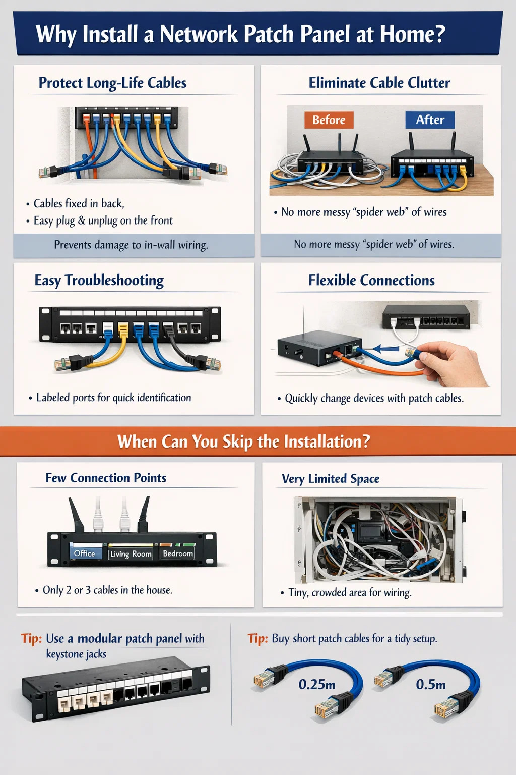 আপনি যদি চান যে লিভিং রুমের পোর্টটি আজ রাউটারের সাথে এবং আগামীকাল সরাসরি সেট-টপ বক্সের সাথে সংযুক্ত হোক, তাহলে আপনাকে কেবল প্যাচ প্যানেলের সামনের অংশে একটি ছোট প্যাচ কেবল পরিবর্তন করতে হবে, দেয়ালে চাপা দেওয়া লম্বা তারগুলি মোকাবেলা করার জন্য টেবিলের নীচে ক্রল না করে।