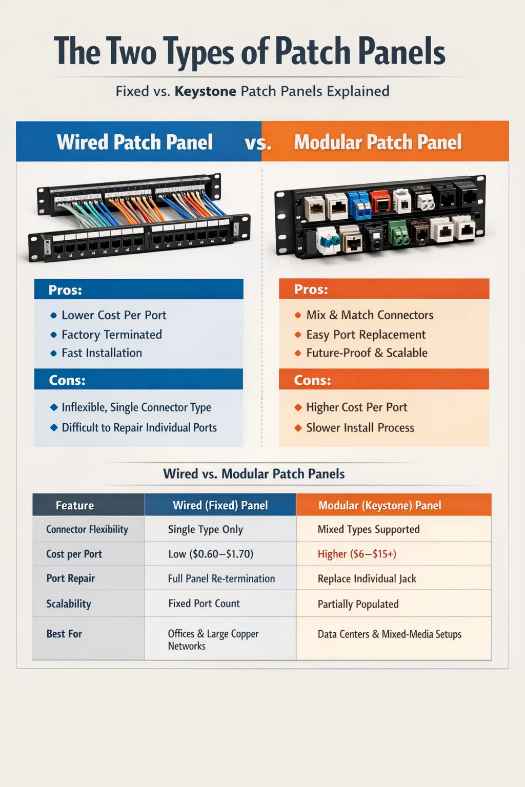 একটি তারযুক্ত এবং মডুলার নেটওয়ার্ক প্যাচ প্যানেলের মধ্যে নির্বাচন করা চারটি ব্যবহারিক কারণের মধ্যে নেমে আসে: বাজেট, মিডিয়ার বৈচিত্র্য, প্রত্যাশিত বৃদ্ধি এবং রক্ষণাবেক্ষণের প্রত্যাশা। কোন সর্বজনীনভাবে উন্নত বিকল্প নেই - উভয় প্রকারই প্রতিদিন পেশাদার ইনস্টলেশনে সফলভাবে স্থাপন করা হয়।