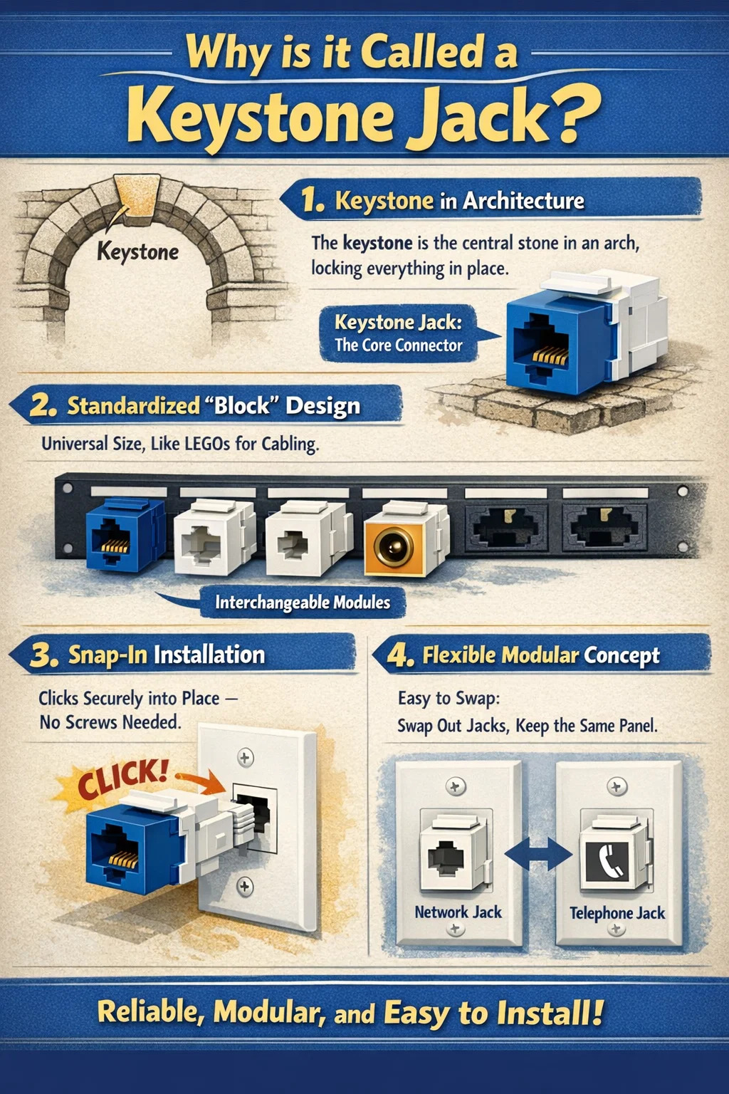 এই নেটওয়ার্ক সংযোগকারীটিকে কীস্টোন জ্যাক বলা হয় তার কারণ এটির নকশা এবং ইনস্টলেশন পদ্ধতির সাথে সম্পর্কিত একটি খুব উপযুক্ত সাদৃশ্য।